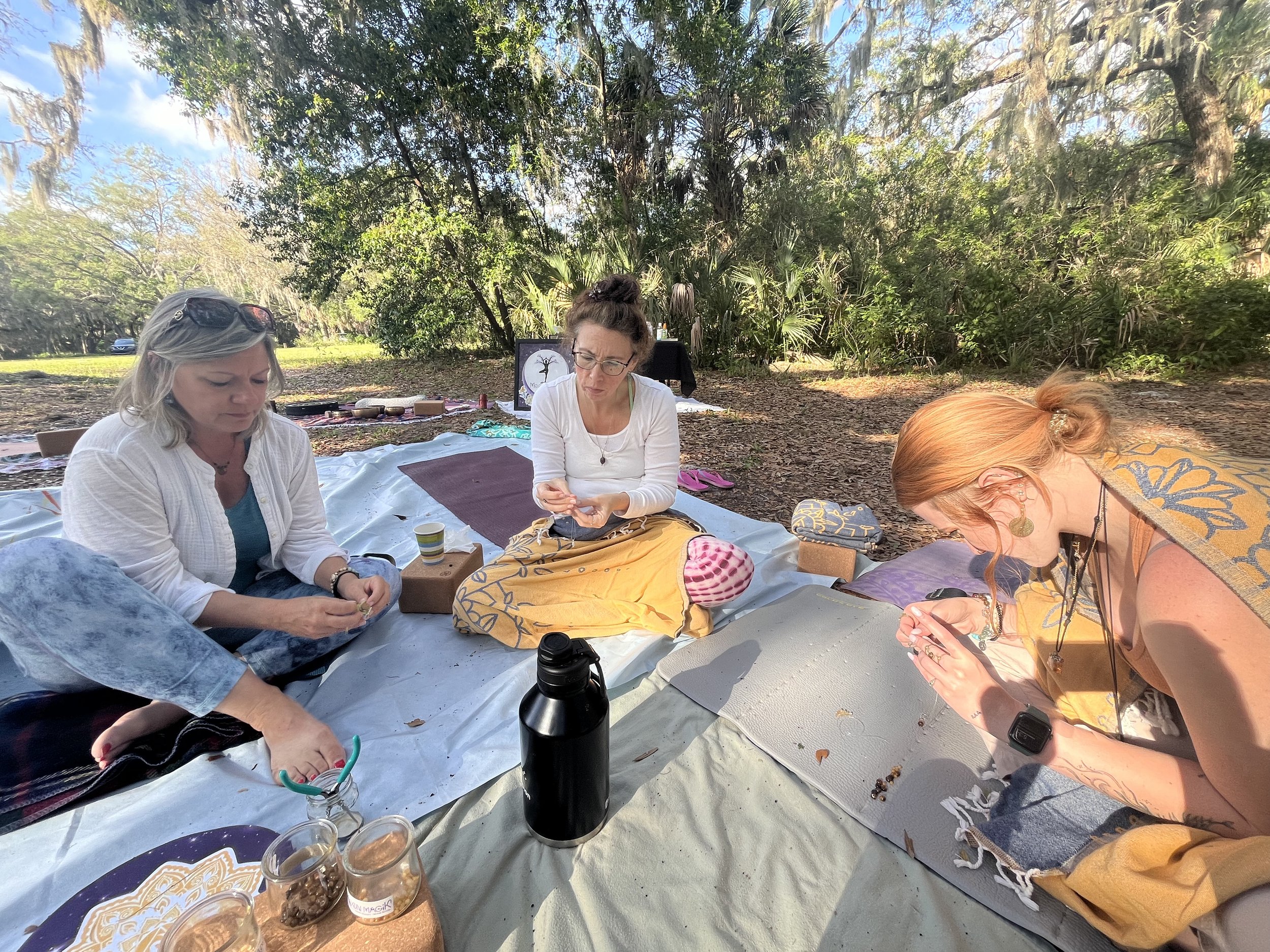 Curated with spiritually charged crystals, stones, herbs and all representations of that day's moon phase, zodiac sign and planet. Each participant is invited to place their jewelry or special belonging on the altar so they may be charged during the ceremony.